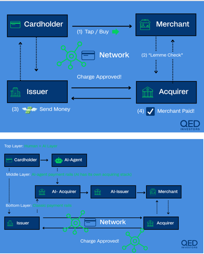 Um relatório recente da QED aborda a emergência dos pagamentos agênticos, realizados por bots autônomos em nome dos consumidores. Ao introduzir um agente de IA entre comprador e vendedor, o fluxo transacional tradicional — com quatro partes (emissor, adquirente, bandeira e comerciante) — pode se expandir para seis ou até nove partes, dependendo de como o agente gerencia as credenciais de pagamento.